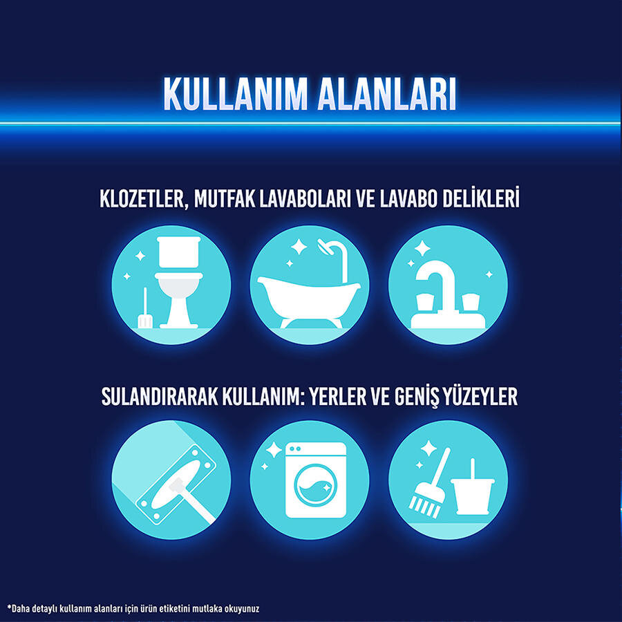 Klozetler: Klozet temizleyici olarak kullanmak isterseniz klozetin kenar kıvrımının içine üst kısmından başlayarak sıkın ve gece boyunca beklemeye bırakın.
